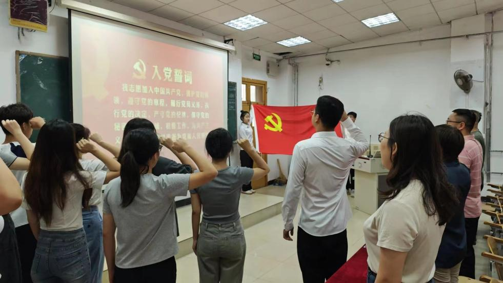 宣誓仪式在庄严的国际歌中拉开序幕,学院领导为新党员佩戴党徽,全体师生党员面向党旗、高举右手、庄严宣誓: