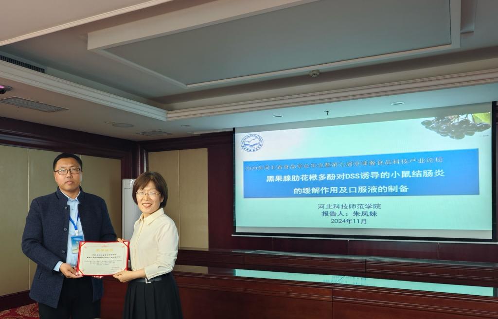 大会设置了京津冀果蔬加工产业发展论坛,畜产品、水产品加工产业发展论坛,河北特色功能食品产业发展论坛暨食品安全检测技术研讨,油脂、谷物加工产业发展论坛等4个专题论坛以及2个研究生论坛。公司经理侍朋宝副教授应邀主持河北特色功能食品产业发展论坛暨食品安全检测技术研讨分论坛,副经理朱凤妹教授作题为《黑果腺肋花楸多酚对DSS诱导的小鼠结肠炎的缓解作用及口服液的制备》的报告并应邀主持了研究生论坛,阎贺静副教授作题为《美极梅奇酵母及其在葡萄酒酿造中的应用》的报告,宋丽军教授作题为《板栗精深加工技术研究进展》的报告,公司研究生陀龙龙、潘新元、李淼、王胤臻、周超越、孙一凡、冯程程、王辰宇共计8人在研究生分论坛中分别就各自的研究成果进行了汇报。