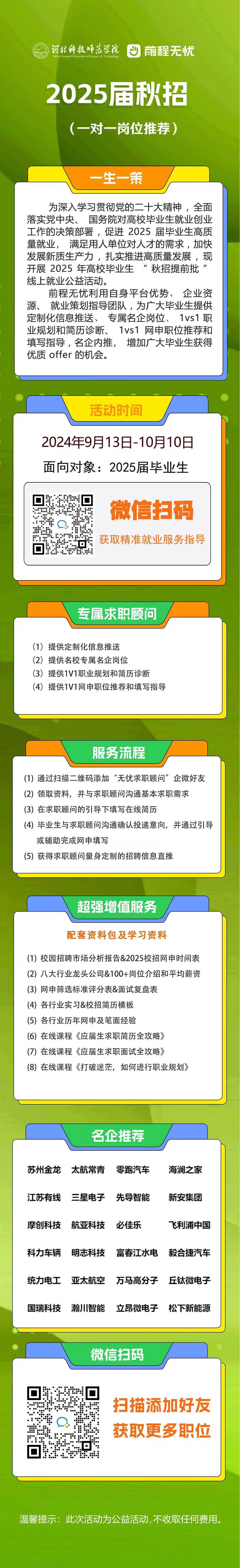 为深入学习贯彻党的二十大精神,全面落实党中央、国务院对高校毕业生就业创业工作的决策部署,促进2025届毕业生高质量就业,公司现开展2025年高校毕业生“秋招提前批”线上就业公益活动。