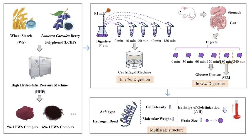 本研究发现,高静水压技术(HHP)能促进蓝靛果多酚(LCBP)与小麦淀粉(WS)以氢键结合。200-600 MPa的HHP处理促使WS糊化,破坏其颗粒结构,增大粒径(P<0.05),降低结晶度与分子量。LCBP和HHP对WS均为物理改性,协同处理显著降低糊化焓△H(P<0.05)。添加6%、10% LCBP并经600 MPa-30 min处理的LPWS复合物呈A+V型结构。抑制淀粉消化能力上,单独HHP处理强于单独添加LCBP,二者协同作用进一步提升淀粉抗消化性,还能抑制WS双螺旋结构生成,减弱淀粉糊凝胶强度与粘弹性。该成果为淀粉基食品改性及酚类-淀粉相互作用研究提供理论支撑。(编辑:刘素稳;审核:彭妍)