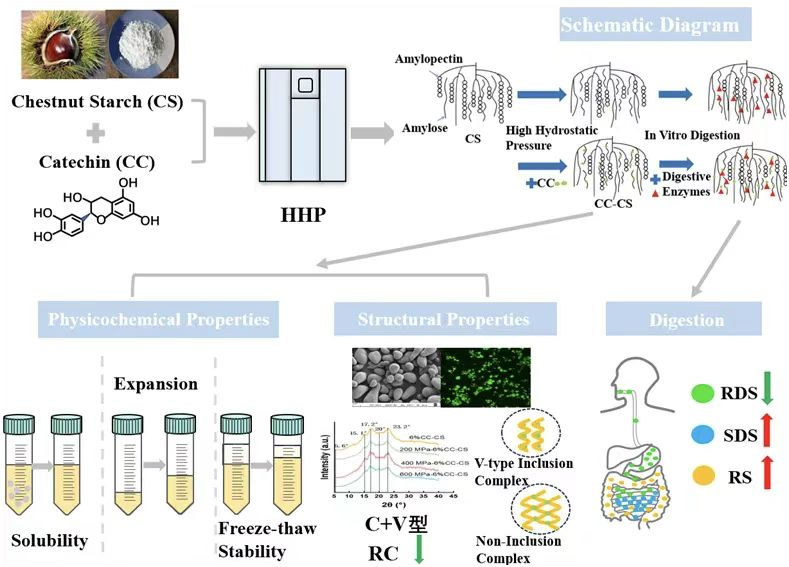 首次研究了高静水压技术(HHP)对儿茶素-板栗淀粉复合物(CC-CS)的理化、结构和消化特性的影响。HHP处理使CC结合到CS链,有助于增加CC-CS的复合度、溶解度和溶胀力,使冻融稳定性增强。CC-CS在HHP条件下呈v型结构,结晶度下降,表明HHP能够形成淀粉复合物,并且HHP处理后样品的分子有序度下降,热性能发生变化。此外,CC改变了HHP下CS的消化过程,降低了HHP作用下CC-CS复合物中RDS的比例,同时增加了RS和SDS的比例。淀粉酶对样品的侵蚀逐渐减小,压力越高抑制消化率的作用越显著。这些发现表明,HHP技术可以改善CS的理化特性,降低消化速率,减轻餐后高血糖水平。