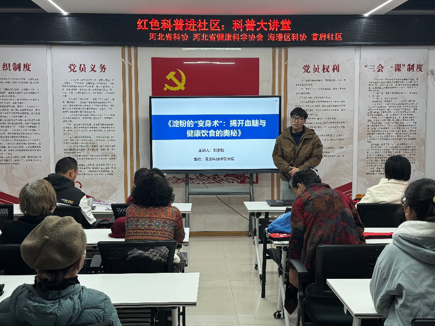 为积极响应国家“健康中国”战略,普及食品营养健康知识,由河北省科学技术协会、河北省健康科学学会联合组织的“红色科普进社区:科普大讲堂”系列活动走进多个社区。2025年10月25日,公司刘素稳教授带领团队师生积极参与,为海港区首府社区居民带来了一场题为《淀粉的“变身术”:揭开血糖与健康饮食的奥秘》的科普讲座。