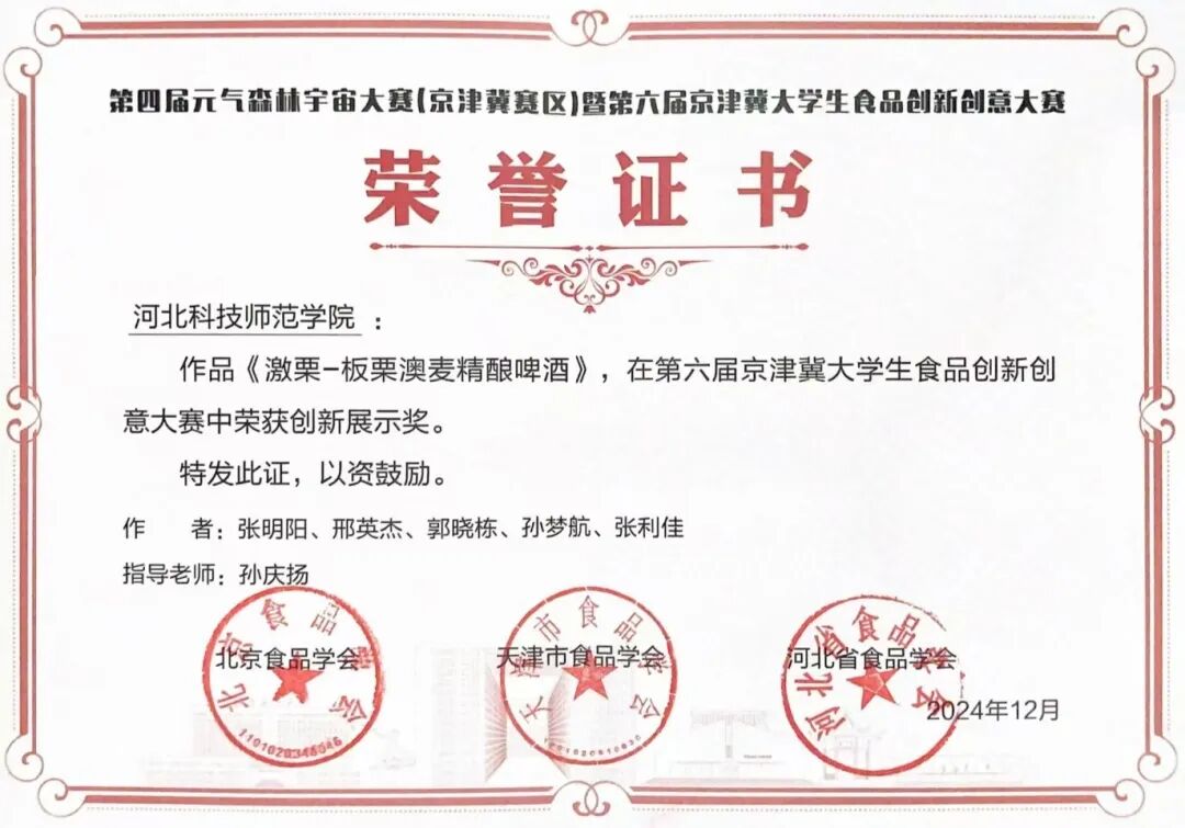 其中,由孙庆扬老师指导,“朋友的酒组”研发的《激栗-板栗澳麦精酿啤酒》,凭借板栗风味与啤酒品类的创新结合,以及年轻化的产品设计,成功斩获大赛“创新展示奖”。