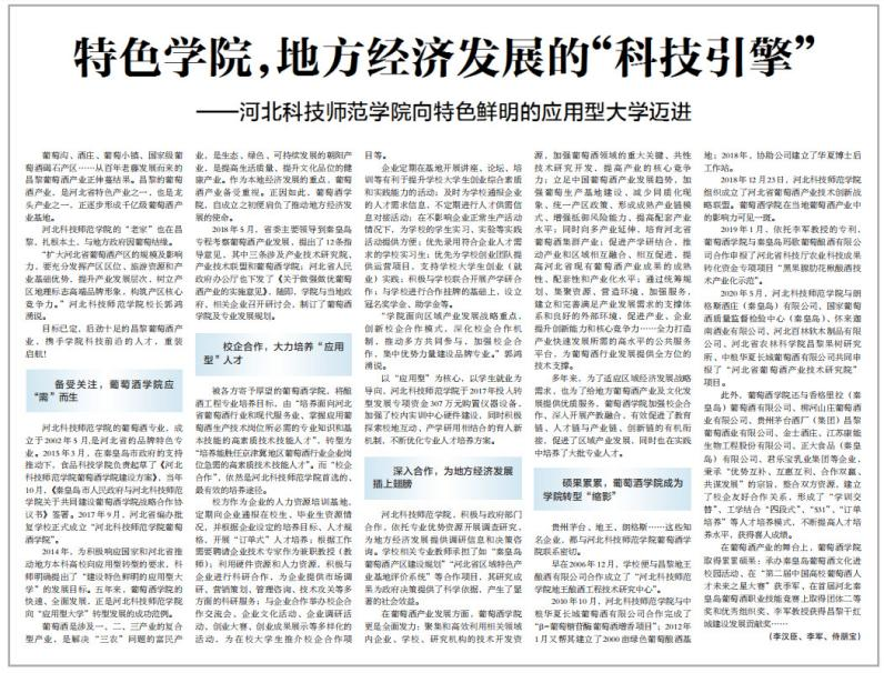 立足河北,面向京津冀,服务全国,以葡萄与葡萄酒需求为导向,构建与酿酒葡萄生产、葡萄酒酿造、葡萄酒营销等产业链相对应的人才培养课程体系。产业学院建设目标明确,定位精准,为行业企业输入高质量人才的同时,汇集校企双方资源进行技术创新,有效提升企业产品的竞争力。