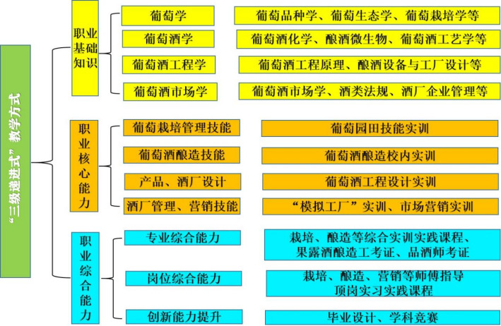 “教练融合”是指采用“三级递进式”教学方式。第一级,重构农、工、文、法等学科融合的专业课程体系;与企业合作开发专业教材和课程资源,促进课程内容与技术发展衔接。第二级,从产业链岗位核心能力要求出发,根据葡萄与葡萄酒生产的季节性适时安排专业实践课程,采用员工顶岗、田间和车间的现场实境教学方式传授理论和技能,推进教学过程与生产过程对接。第三级,由企业专家“师傅”手把手传授,融入职业技能等级考核内容,实现“教、学、做、练、评”一体化。